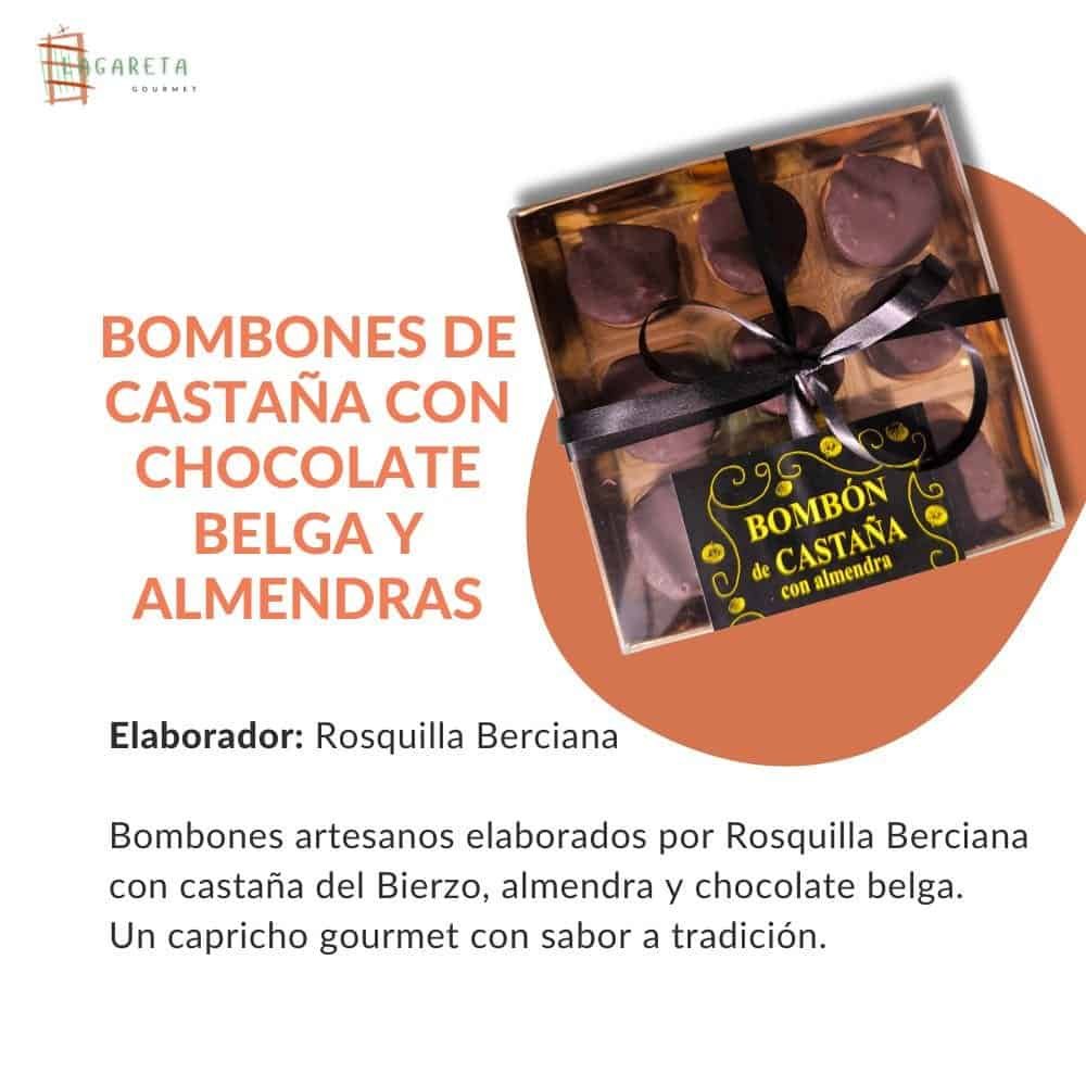 Bombones artesanos elaborados por Rosquilla Berciana con castaña del Bierzo, almendra y chocolate belga.